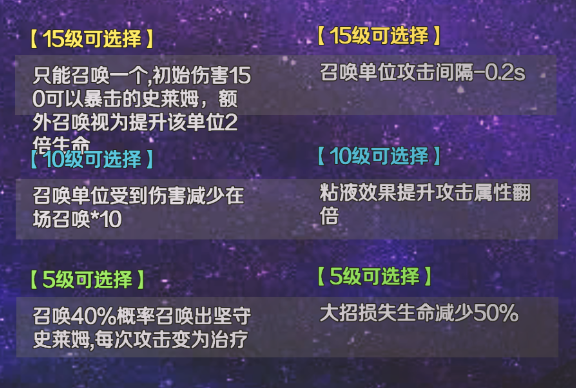二,核心靠15级左侧天赋,集中召唤一个大哥史莱姆,配合大招快速让大哥成长起来,一刀999!