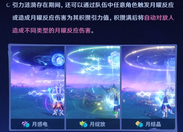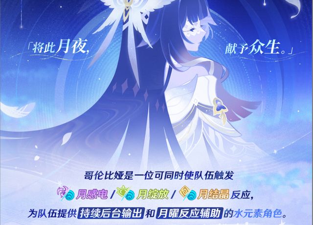 首先,哥伦比娅的定位,官方的定位为,“可同时使队伍触发”“月感电、月绽放、月结晶反应”,而且,还能为队伍提供“持续后台输出”,以及“月曜反应辅助”的水元素角色。