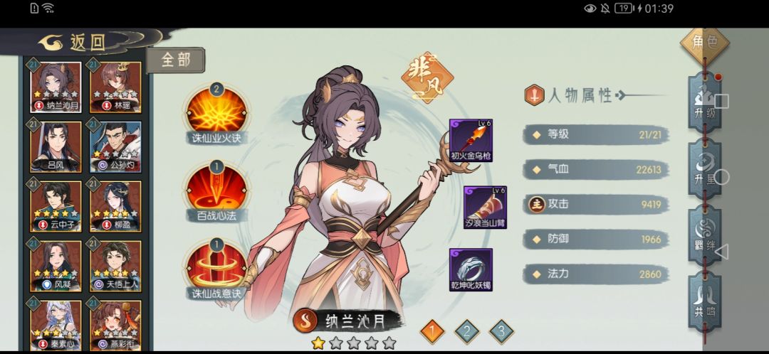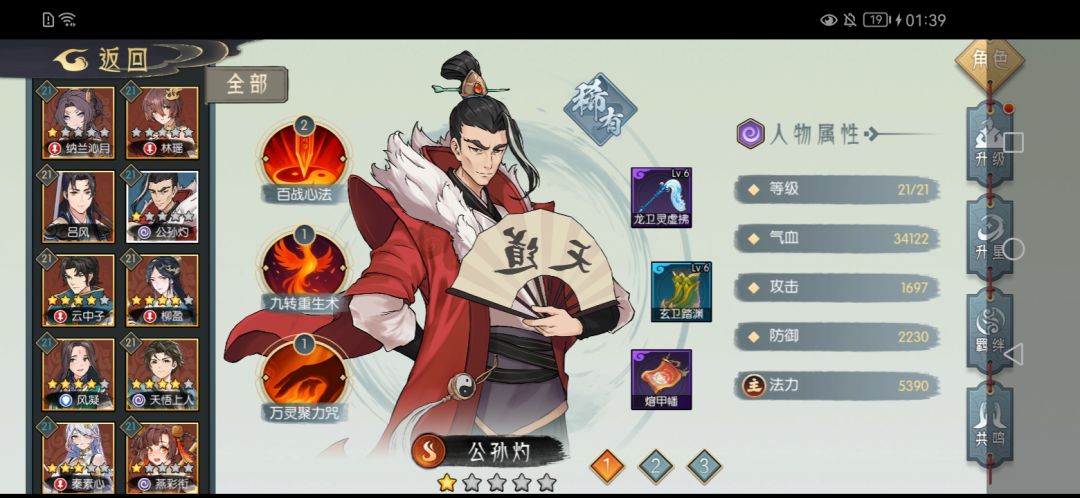 ②第二战阵容搭配如图所示,优先使用公孙灼涅槃其次林瑶(用完记得回天),丹药可有可无,先积累战意再用林瑶燎原诀清小怪,真正的绝杀是纳兰的诛仙业火诀。