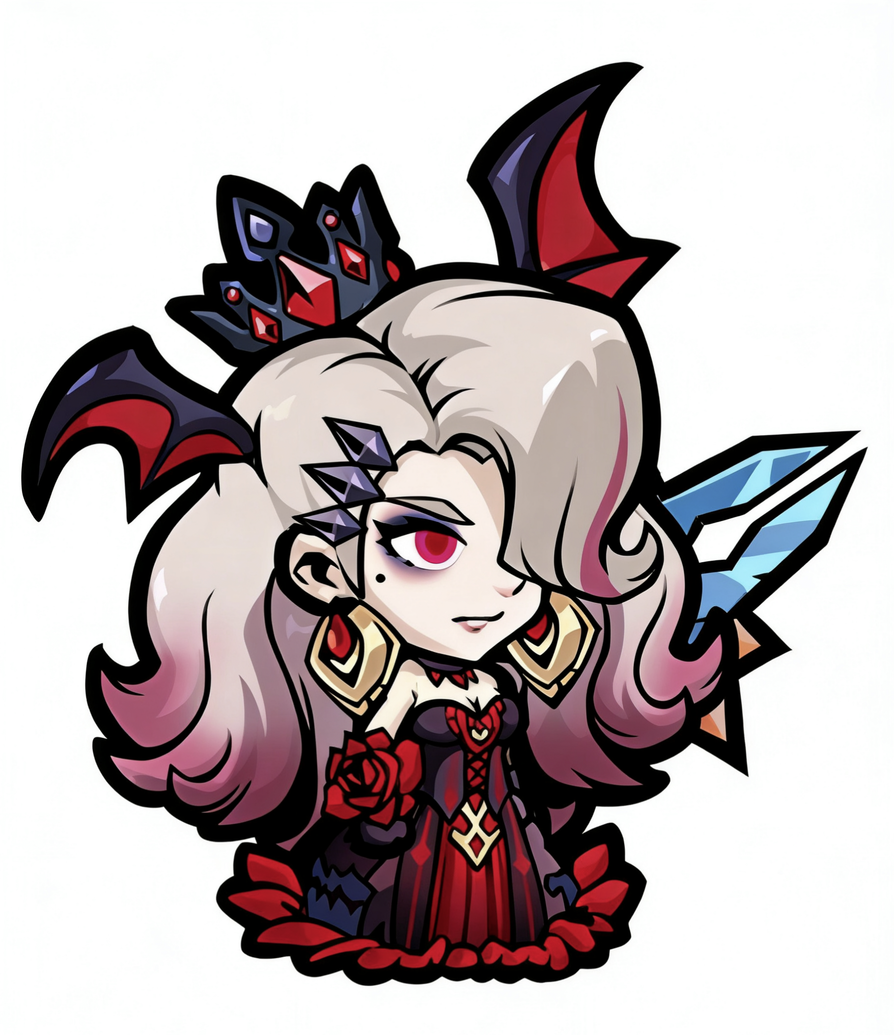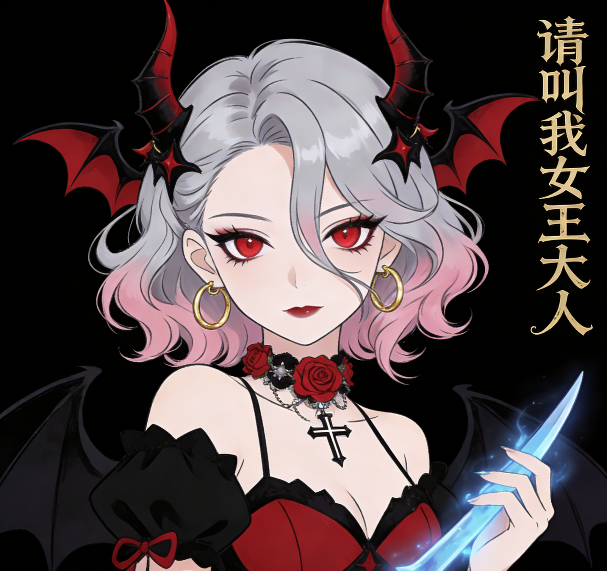 亚克力西斯(接下来简称亚克力):执掌火焰的猩红女王,银灰渐变粉的卷发如暗夜里翻涌的云霞,红黑蝙蝠翼发饰衬得王冠更显冷艳,猩红眼眸里藏着不容置喙的威严。红黑礼裙缀着玫瑰与十字纹章,是属于她的王权标识。仿佛只需抬眼,便有万千魔物俯首称臣。