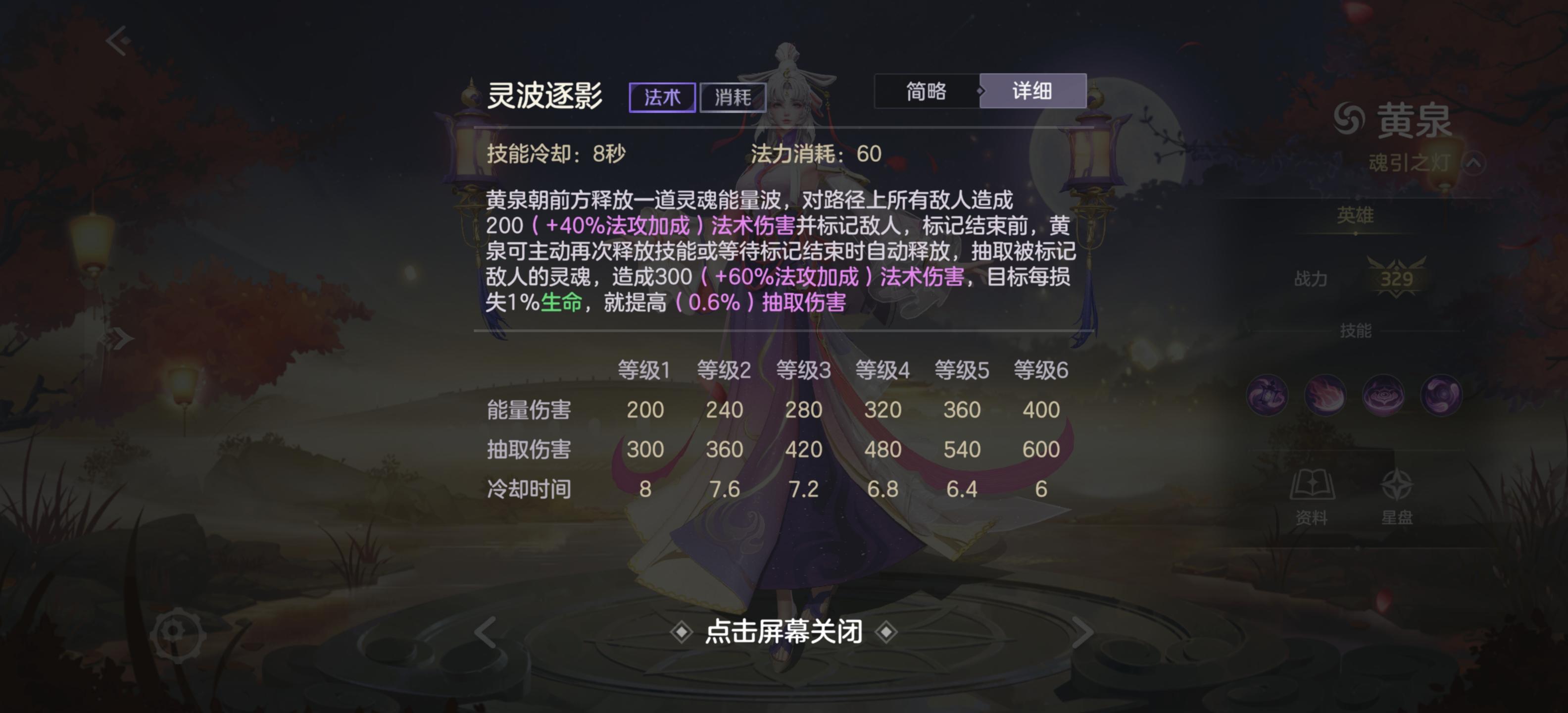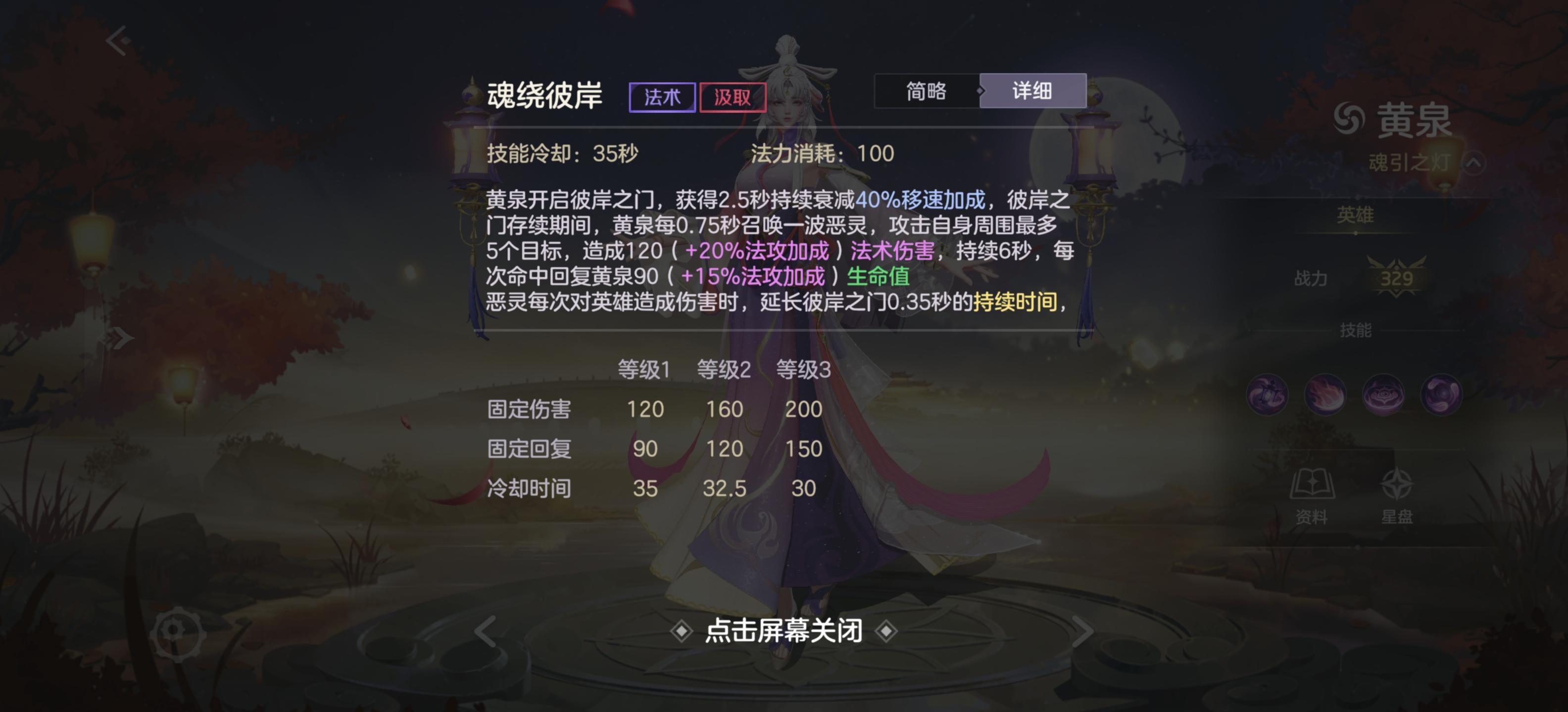 黄泉打开幽魂之门,获得衰减的加速效果,每秒对范围内的至多三个敌人造成伤害并回复生命值,若伤害目标为英雄,还会延长此技能持续时间。