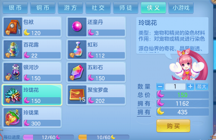 侠义值就包袱,满了后买玲珑花