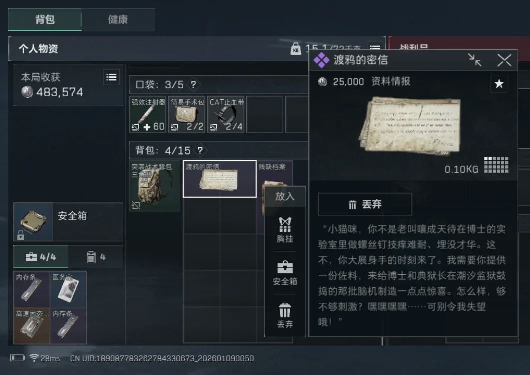 击败渡鸦信使后,其盒子必掉【渡鸦的密信】,价值25000哈夫币!强烈建议保留,可能与后续限定高级奖励(如“大红”) 相关联。
