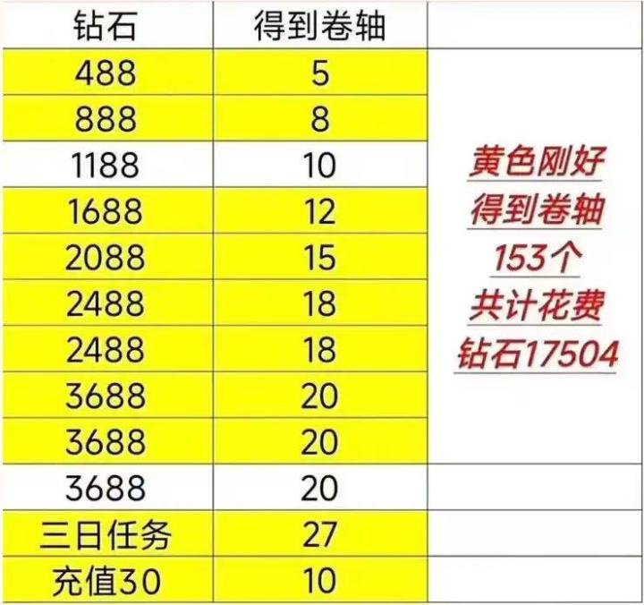 2. 付费渠道:30元档额外得10卷轴;拉满3轮需约1.75w钻石,可按预算选择。