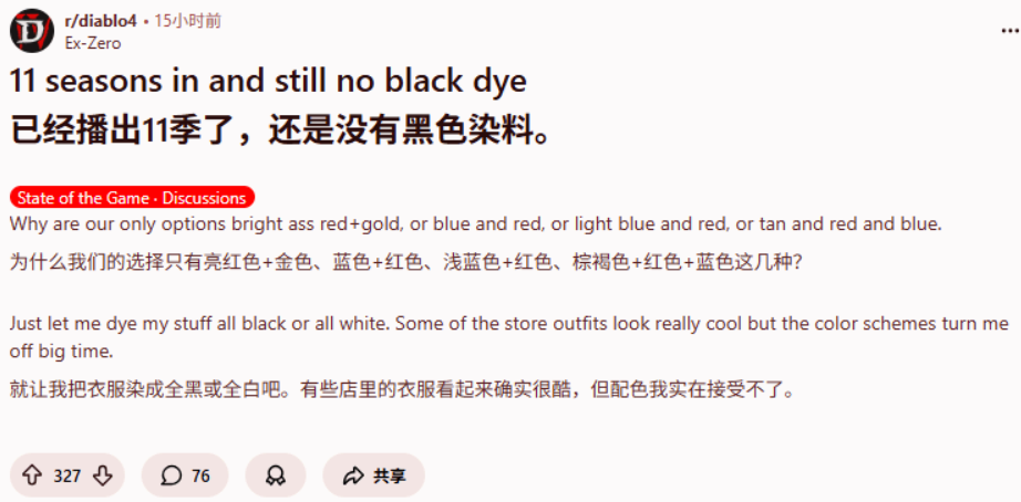 《暗黑破坏神4》已更新至第11赛季,距离发售已过去两年半,但“纯黑染料”这一看似基础的外观自定义功能仍未上线。