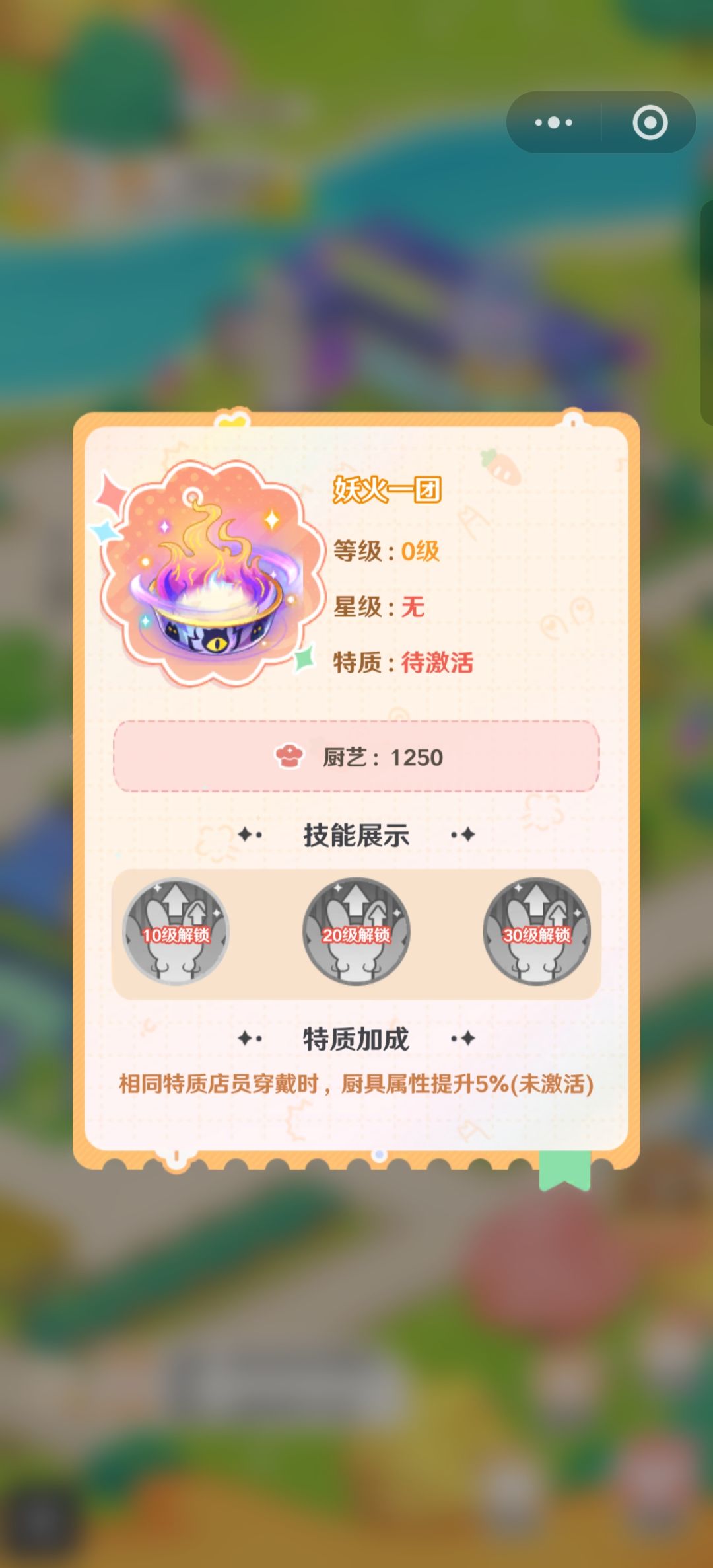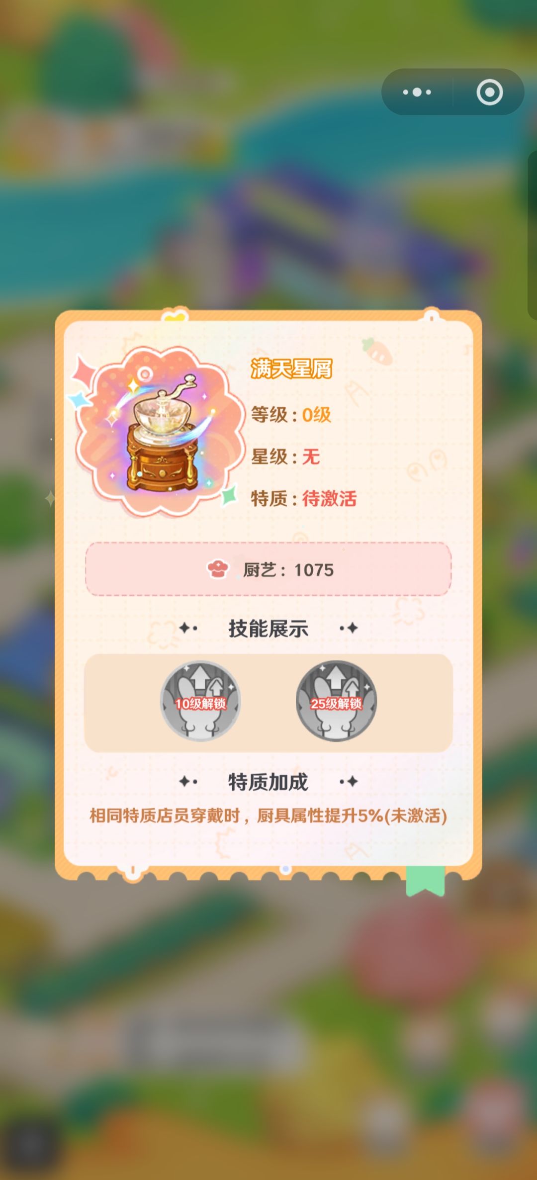 3、厨具特质:用神奇之火随机重塑5种属性,首次重塑需8个,若是出来的不是组队店员要的属性,可以再花费1个重塑。同属性的厨具给到同属性的店员会有属性加成(厨艺会按照百分比增多)也可以进行特质升级。