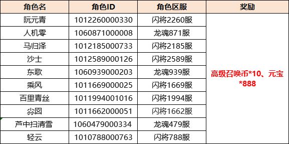 「高级召唤币*10、元宝*888」