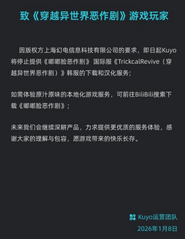 1月8日,知名手游工具Kuyo发布公告,应版权方B站(上海幻电信息科技有限公司)要求,即日起正式停止《嘟嘟脸恶作剧》国际服、韩服的下载与汉化服务,并建议玩家前往B站下载国服版本。这一举措标志着B站拿下该作代理权后,开始对民间汉化及外服直连渠道全面“清场”。