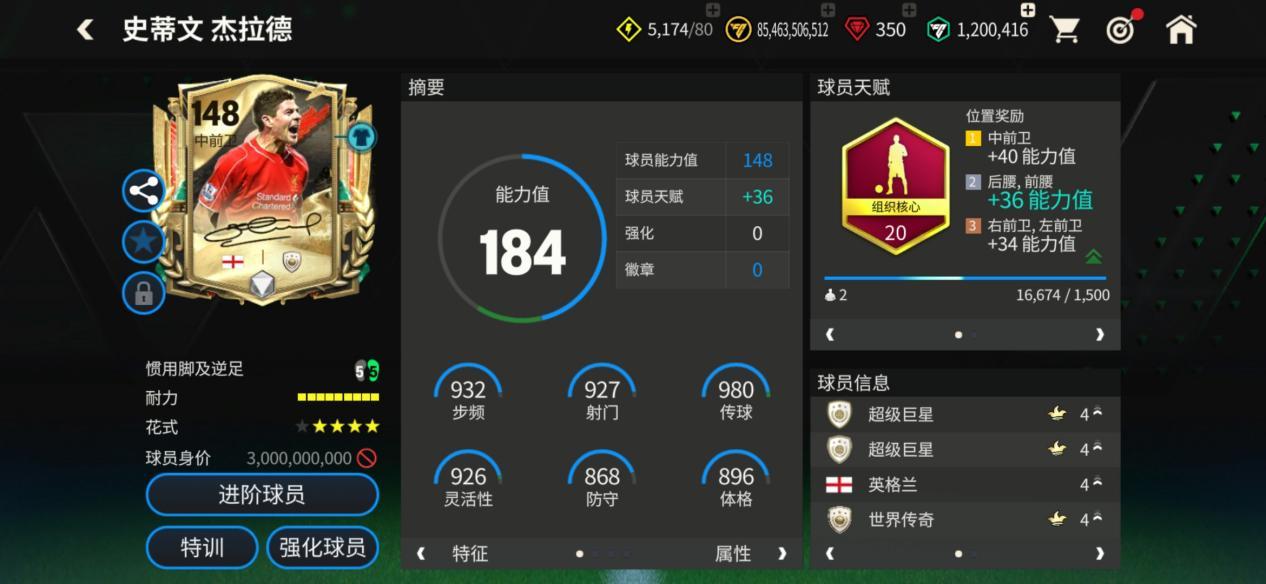 杰拉德搭配了组织核心的天赋,对他的短传、长传、视野、盘带、反应五项特性进行大幅提升。花式方面,基础花式为高级油炸丸子配合四星花式等级,有着较强的花式能力。实战中杰拉德有着出色的组织能力,是球队向前推进的节拍器,出色的体格给予了他优秀的抗干扰能力且能在防守端有着出色的拦截表现,是一位顶级的中前卫。