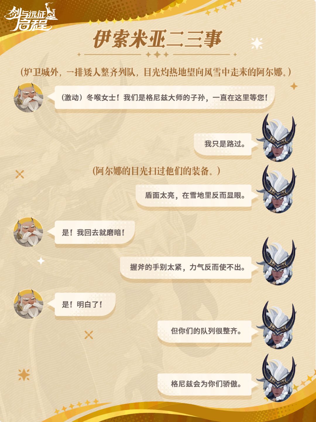 本期《伊索米亚二三事》,为大家带来阿尔娜与矮人们碰面的现场,一起来看看吧~