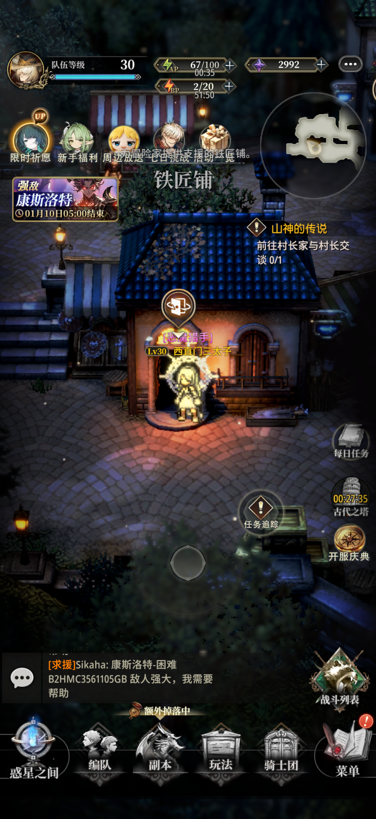 传送到兰顿城戴林斯区,直接往前走是面包店,和 NPC 交互能购买;直接往左走是铁匠铺