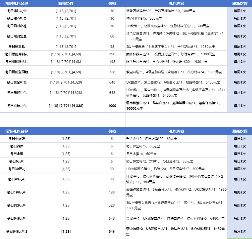8、冬日礼包,冬日将会更新两种冬日礼包-常驻和限时循环礼包。