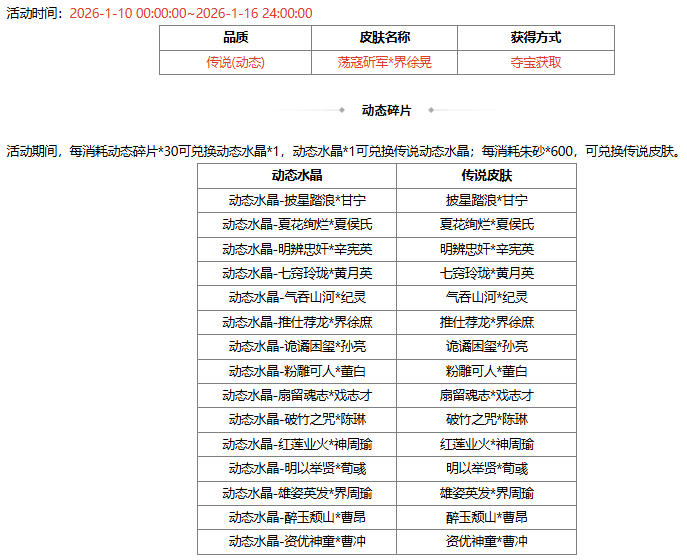 *2026-1-10 00:00:00 ~2026-1-16 24:00:00,荡寇斫军*界徐晃(动态) 180夺宝碎片、归鸿无觅*屈晃 70夺宝碎片 限时上架夺宝商店。2026-1-17 00:00:00 起,荡寇斫军*界徐晃(动态)、归鸿无觅*屈晃 下架。
