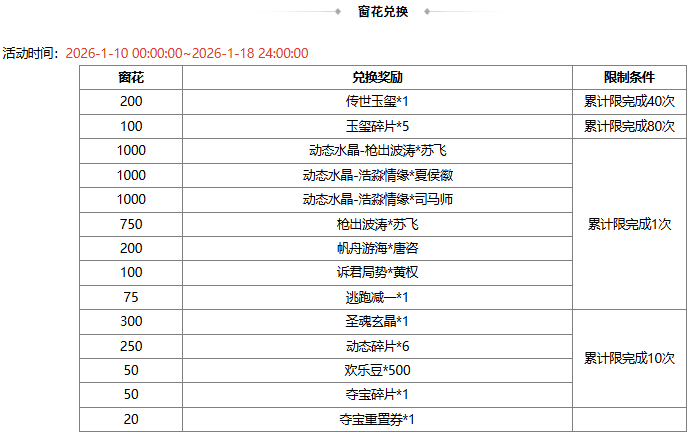 2、窗花 2026-1-19 00:00:00 到期,到期自动删除不回收。传世玉玺未消耗的可用于下期活动;