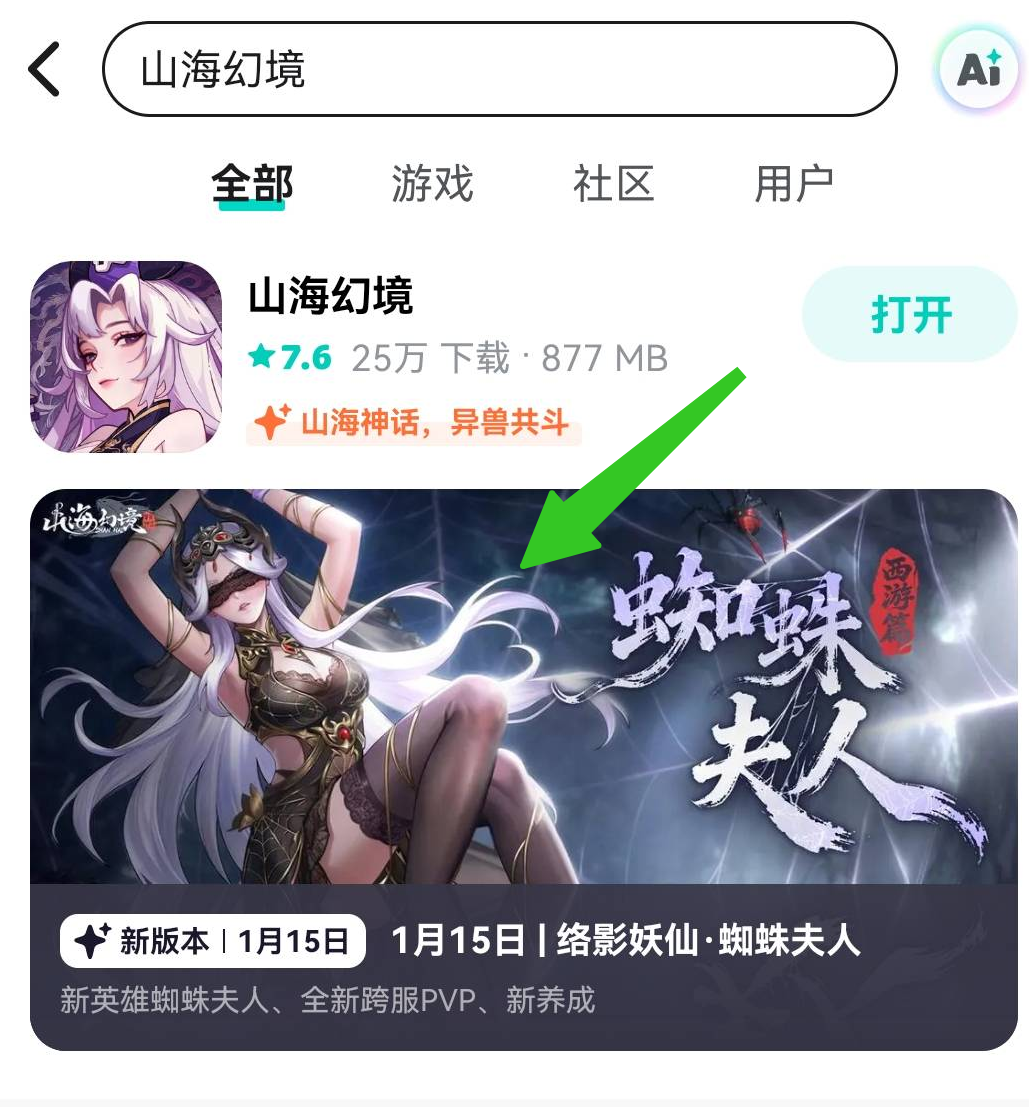 【第一步】找到新版本预约功能方式1:在TapTap中搜索《山海幻境》,游戏下方即有新版本展示页,点击进入。