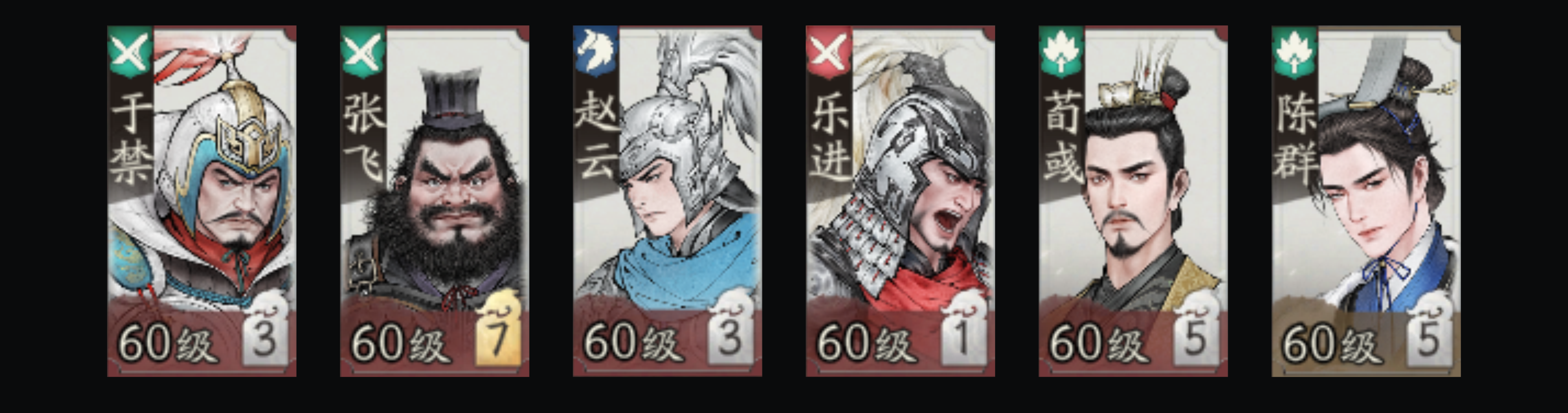 于禁、张飞、赵云、乐进、荀彧、陈群