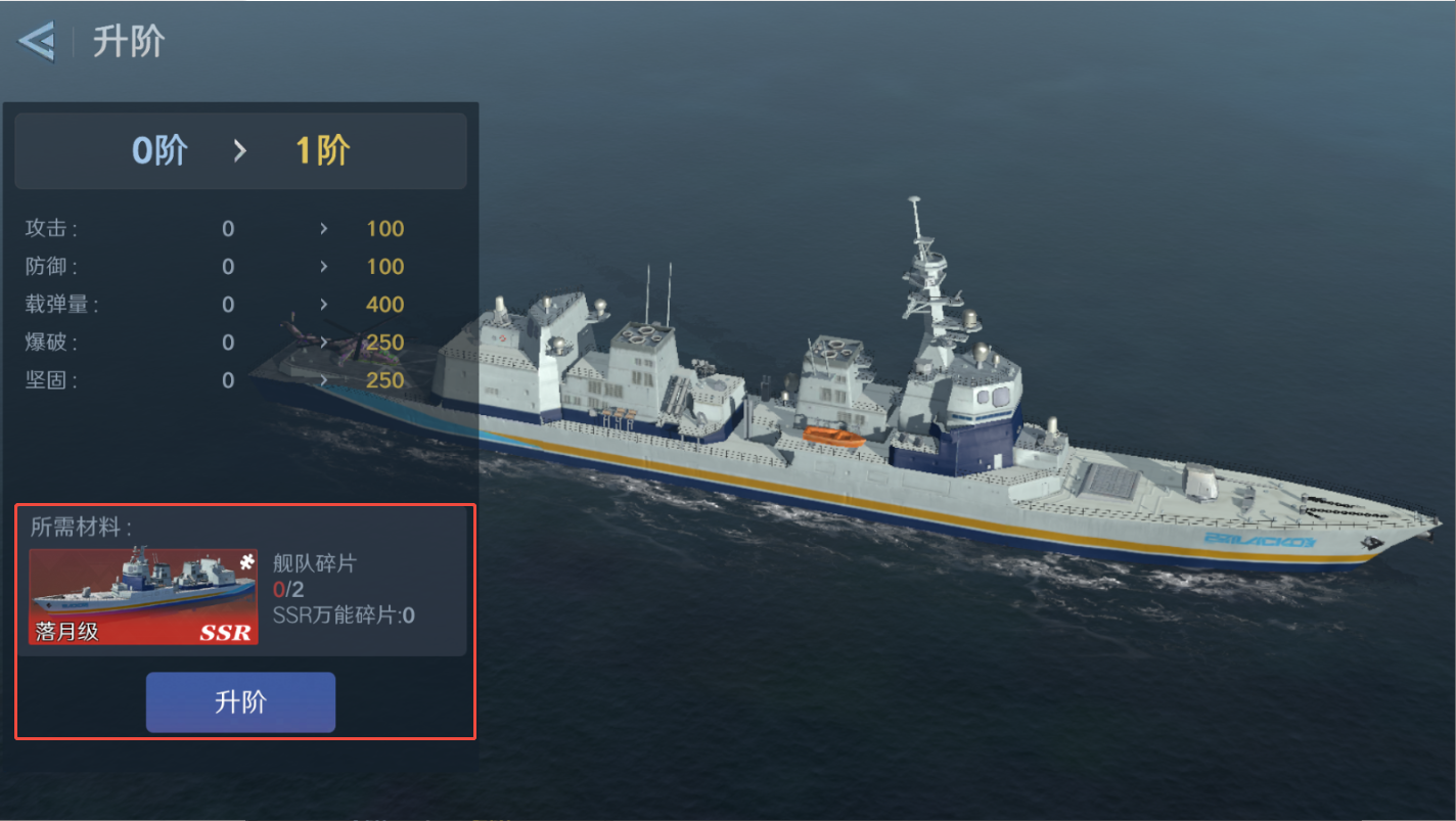 ●品阶:使用同名碎片/万能碎片升星,每阶提升基础属性+战舰技。