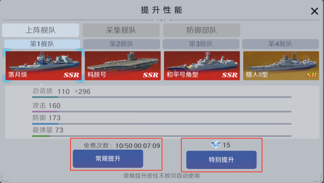 ●性能:R以上舰船专享,分为免费提升和特别提升,12分钟积攒免费1次,或者使用15钻石秒升,优先提升主力舰!