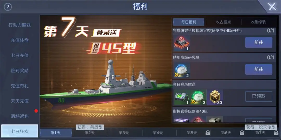 ●七日狂欢:第2天送顶级橙舰,7天签到再送第二艘,轻松凑齐“双橙舰队”,组成初期王牌。