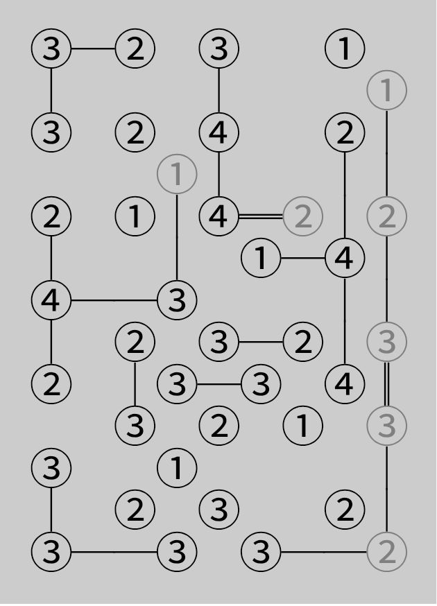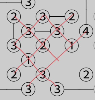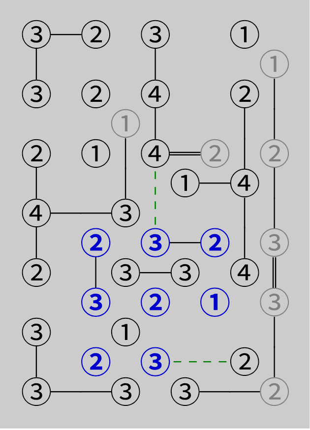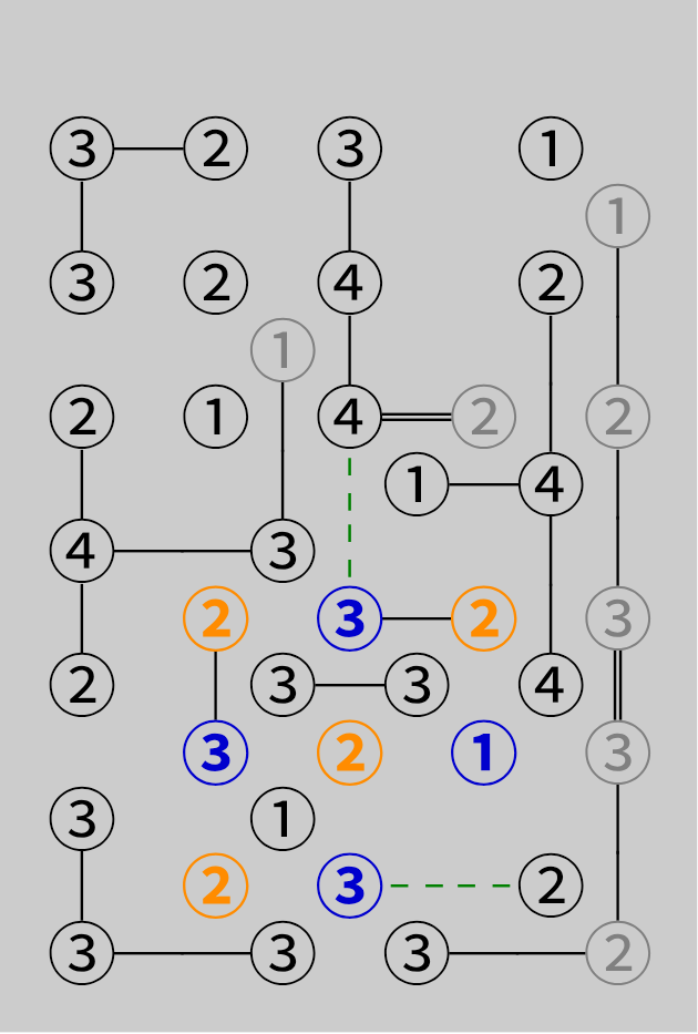 可以发现该群组内岛屿只有两个可以向群组外的搭桥岛屿(绿色虚线),群组内剩余可搭桥数之和1+2+1+2+2+1+2+3=14为偶数,因此外部搭桥总数为偶数,有以下两种情况