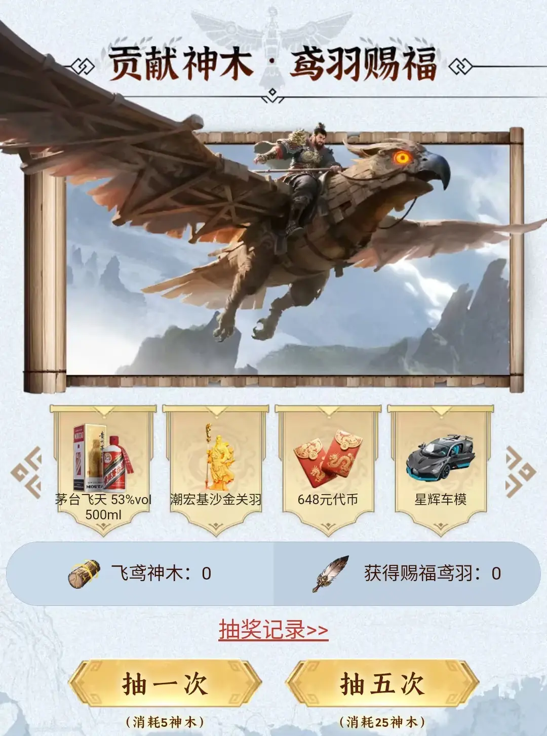「飞鸢神木」积分可直接用于抽奖,5点神木积分抽取1次,元宝、648代币拿到手软,还有星辉车模、500ml茅台、潮宏基沙金关羽这些重磅实物好礼等着你!