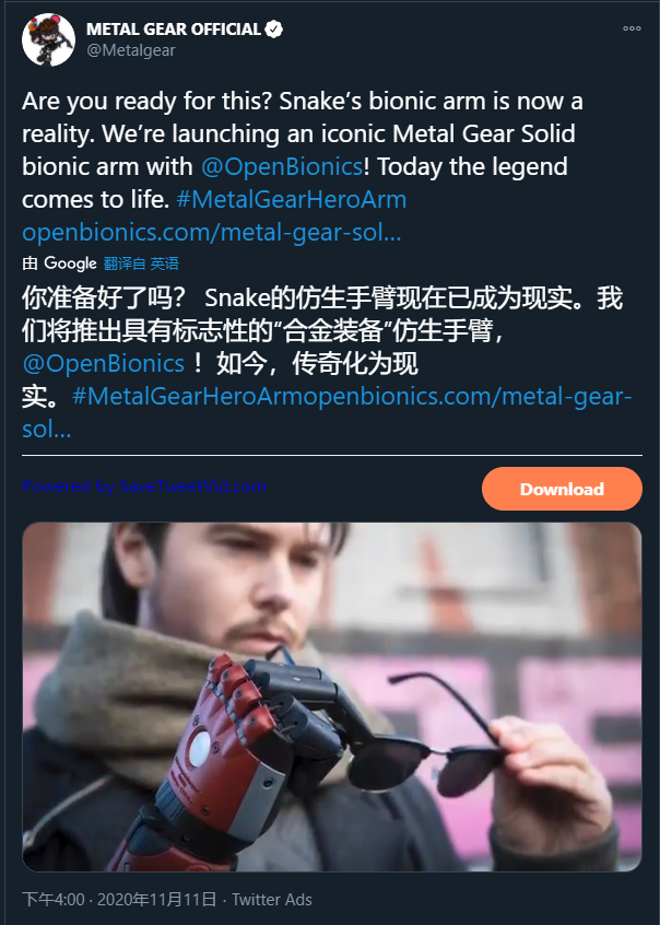 英国仿生手开发公司Open Bionics 与游戏公司Konami合作推出《合金装备5:幻痛》(Metal Gear Solid V: The Phantom Pain)主角“Venom Snake”的仿生手臂,售价599英镑(折合人民币约5251元)。