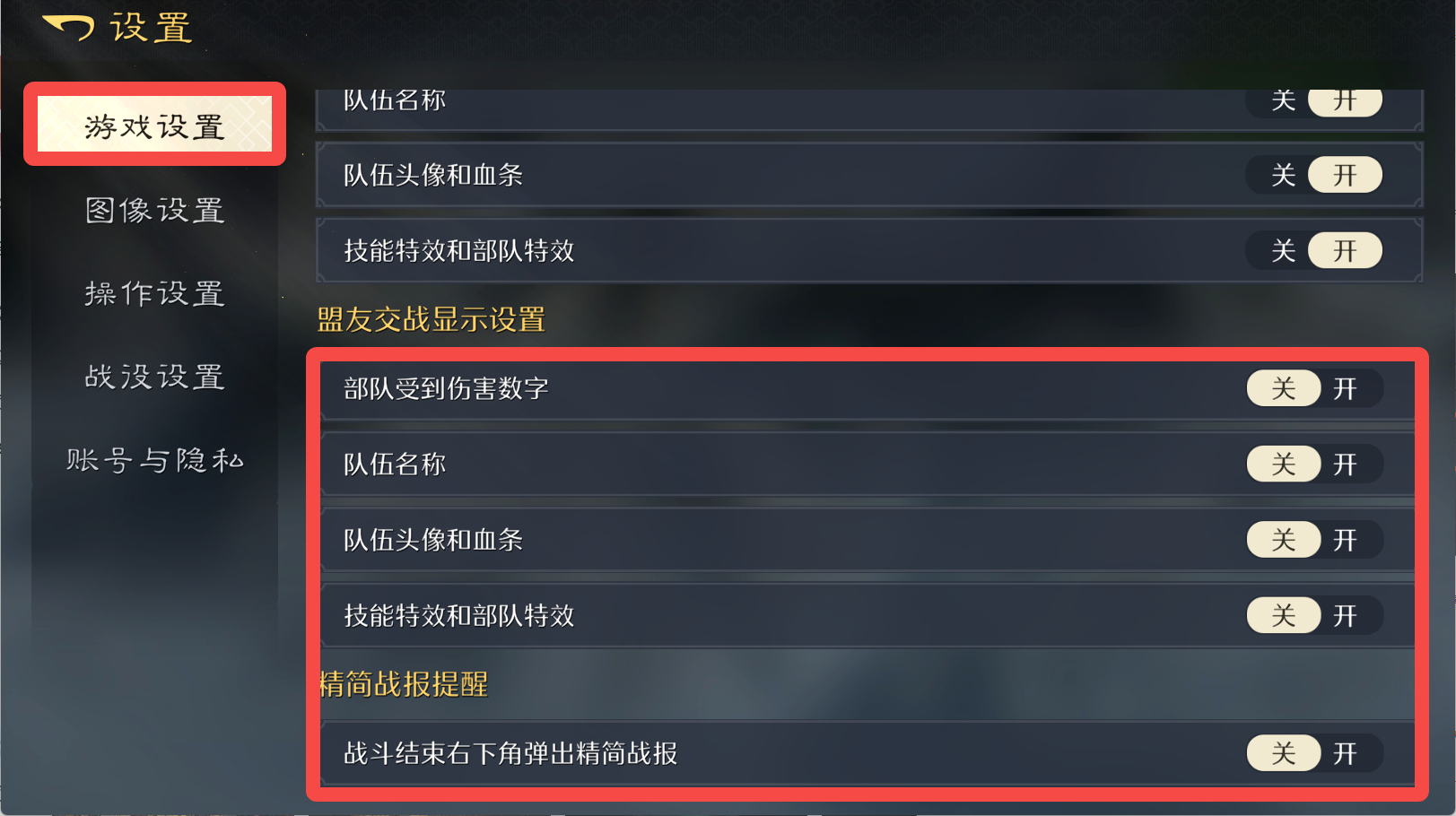 【游戏设置】这里还可以关闭飘字、各类盟友提示与精简战报信息显示,这样可以减少视野干扰。