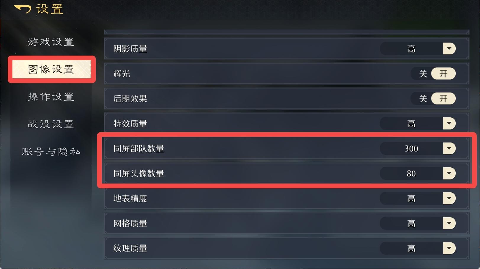 首先是【图像设置】,同屏部队和头像数量建议拉满,这样团战过程中可选的目标会更多,更有利于我们找合适的攻击目标。