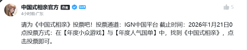 《中国式相亲》开发团队与发行方今日发文报喜,游戏成功入围2025 IGN中国单机游戏年度评选的【年度人气国单】和【年度小众游戏】双项奖项,团队难掩激动与欣喜之情。
