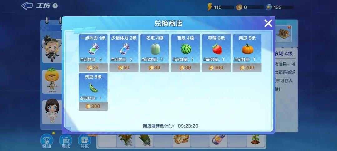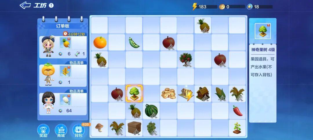 同理1级果木枝向上合成出4级神奇果树也可以通过消耗体力产出1级水果-香蕉,若体力耗尽将暂时无法通过农场或者神奇果树这类特殊物品进行产出,而体力每天0点固定回复100点。