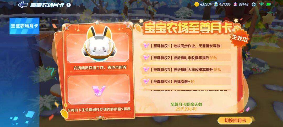 农场精灵操作时还会有专属特效,牌面拉满,专属超V标识,人群中的亮粉色大V,闪耀程度不必多言!还有专属于你的被祈福概率加成,丰收什么的,洒洒水啦~祈福次数+10,农场朋友圈中的大佬,今天请来宝宝的菜地!以及专属建筑升级折扣,该省省该花花,升级更快啦~