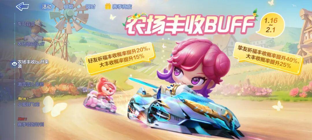 新的赛季新的丰收,让未来充满期待!1月16日起,不但有每周末的常规农场BUFF加成,经验、收获双丰收,还有好友、挚友祈福概率提升限时开放,收获时的满园丰收最是让人满足!