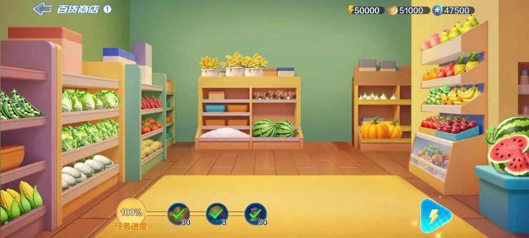 不同的关卡有不同的任务,比如百货商店是填满货架,花店则是装满鲜花,完成当前的所有关卡任务就能解锁下一关,在地图上点亮新的建筑。想要完成任务就需要合成积分,这就需要前往工坊获得,看着是不是一头雾水?不要担心,跟着宝宝走,奖励全到手~