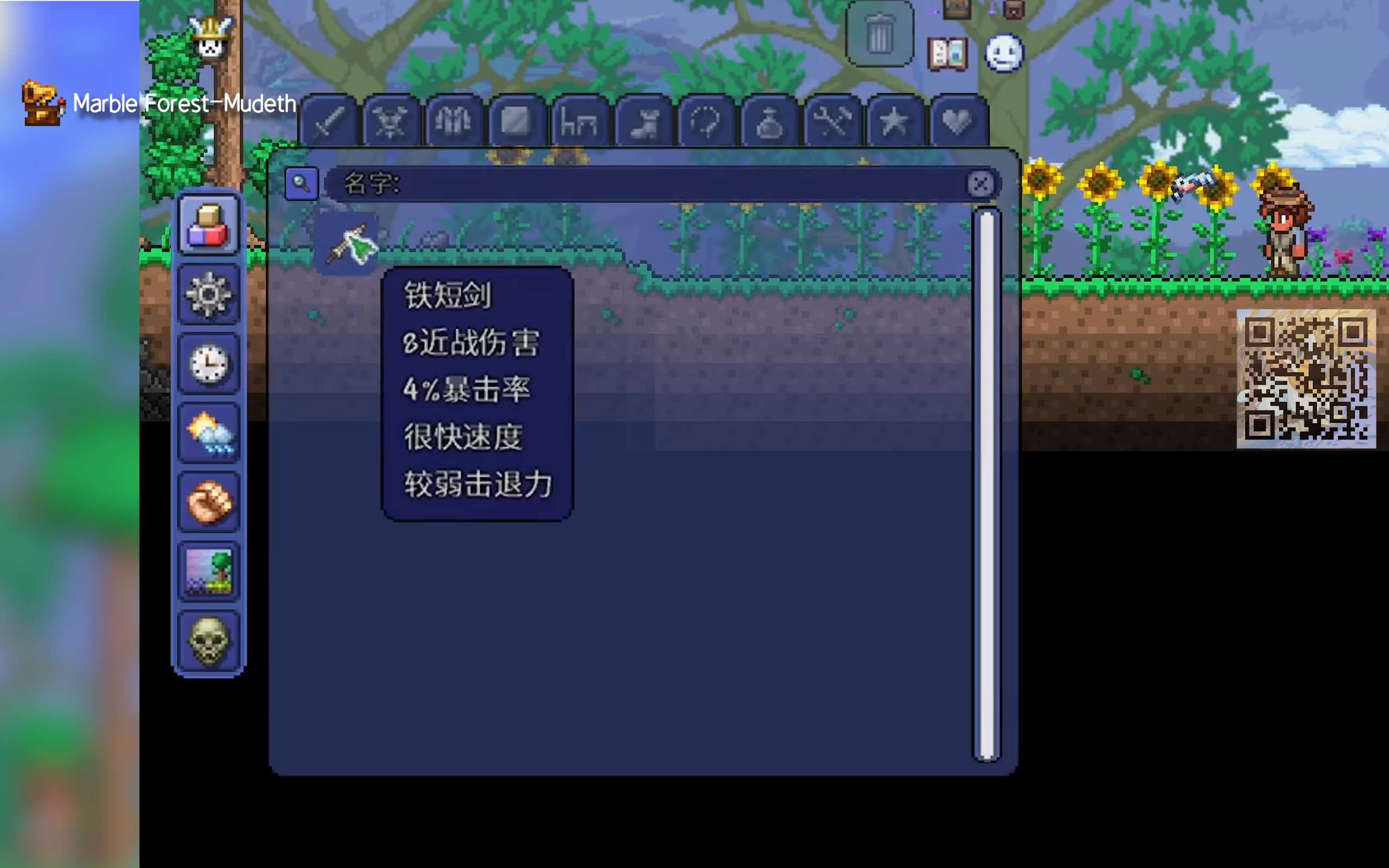 第三个功能时间,包含时间冻结、跳转和加速。时间加速允许玩家在1到24倍速率之间调整时间流逝速度,昼夜更替将会加快,同时一些依赖于时间流逝才能发生的事件会更快地发生,这并不会影响敌怪的刷新,也不会影响已经存在过的敌怪的行为;相对应的,如果你开启了时间冻结,那么昼夜更替将被暂停,依赖于时间流逝的事件也不会发生,你可以通过受时间加速影响的事件来判定哪些事件会受到时间冻结影响。
