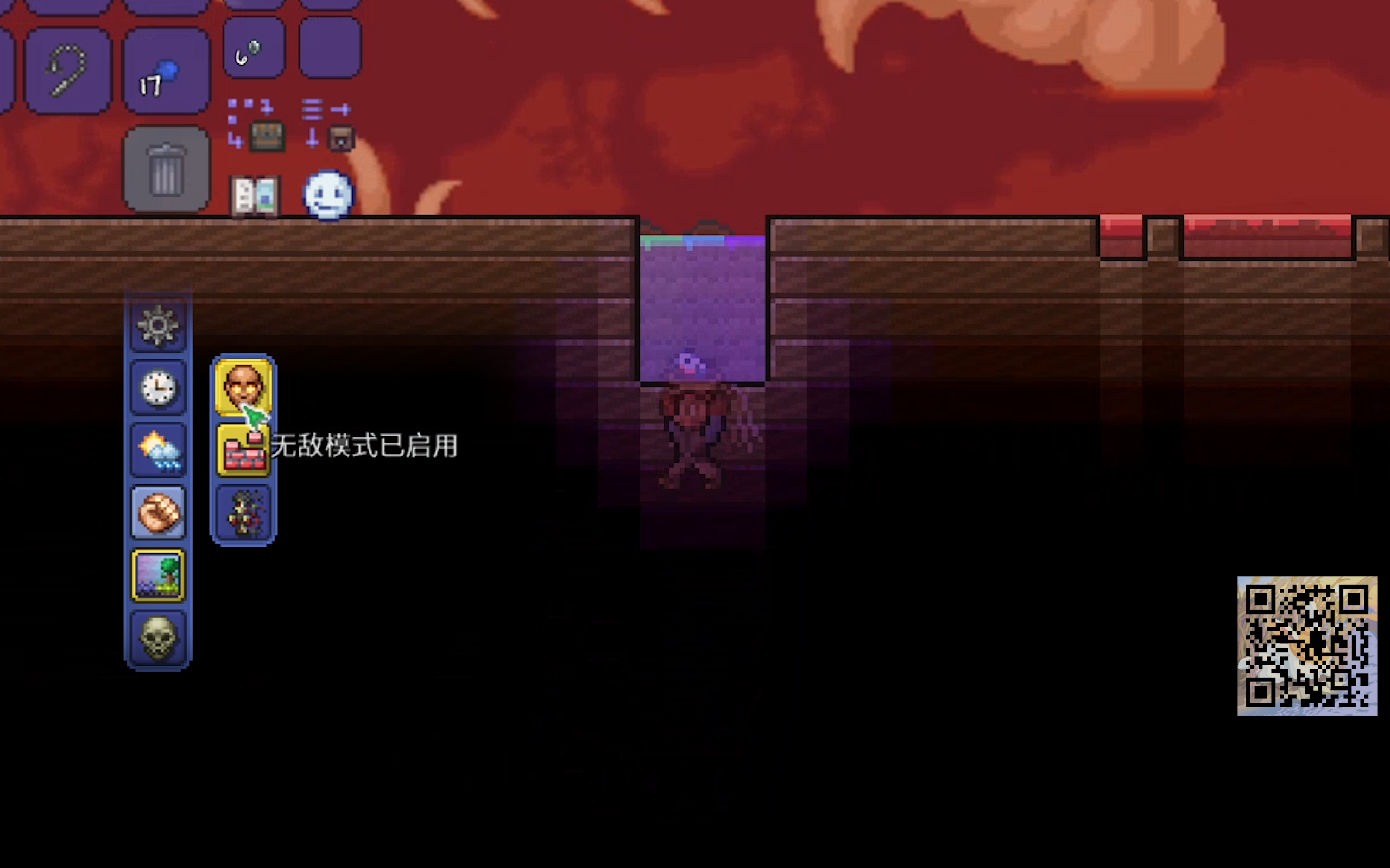 最后是无敌模式(它在一些翻译里被称作“上帝模式”,这里我们以官方wiki中文语言包的翻译为准),无敌模式开启后能够让玩家不受任何伤害,并且可以以快到难以察觉的速度恢复自身魔力,相当于无限魔力,但是它无法免疫负面效果,也不能让你无限飞行。