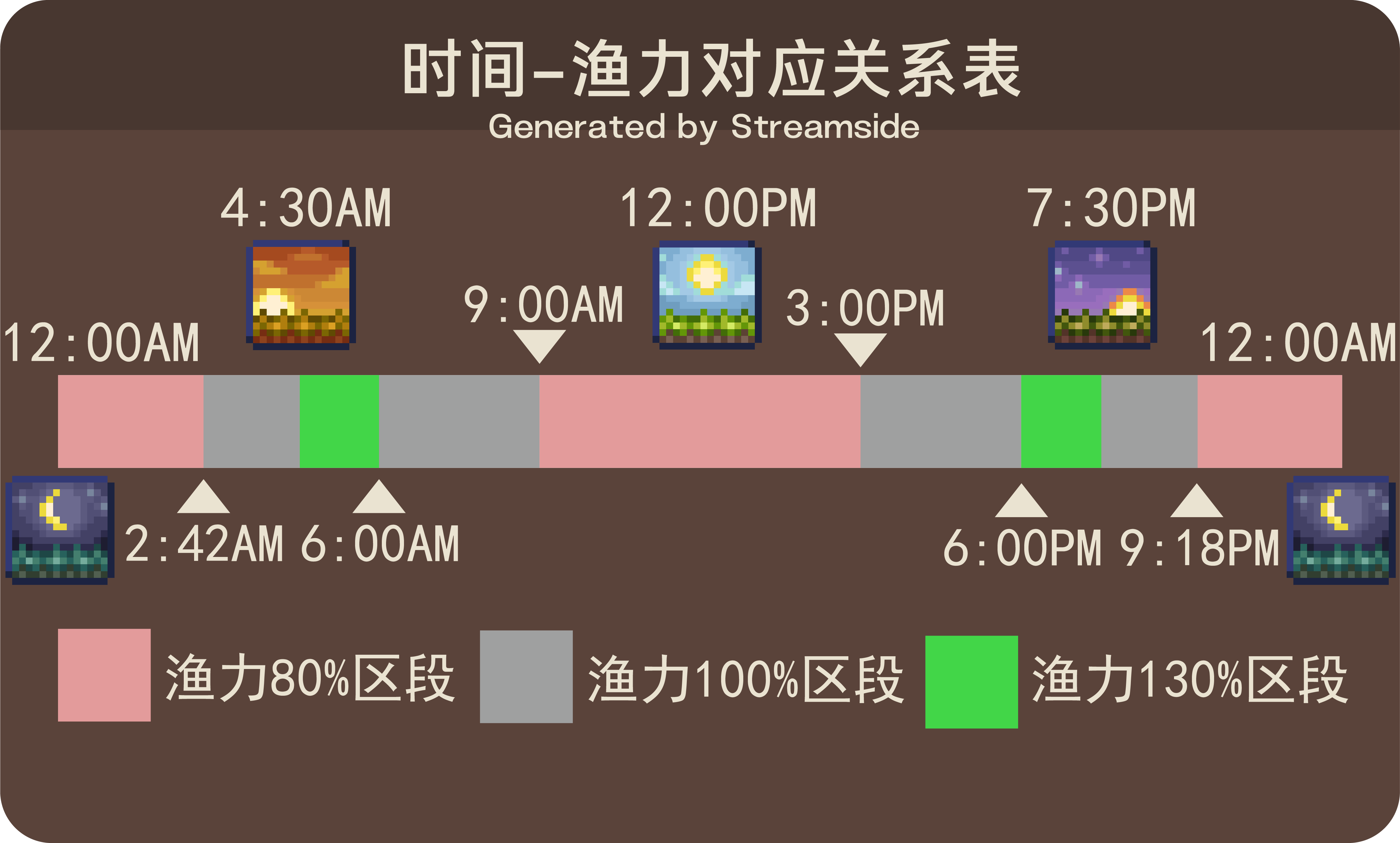 泰拉瑞亚渔力随当天时间变化的对应关系表,同时标注了旅行模式能跳转的时间点