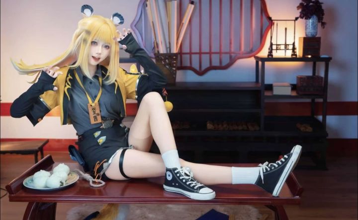 这组槐琥cos堪称神还原!金灿灿的长发搭配标志性的熊耳,毛发的蓬松质感和配色完全贴合角色设定,服饰上黄黑蓝的撞色拼接、腰间的配饰细节都复刻得一丝不苟,背后的狐尾(熊尾)蓬松又有动感。人物的眼神清亮又带着槐琥的飒爽,肢体姿态把角色的干练与娇俏融合得恰到好处,中式背景的红窗棂与角色风格相得益彰,整体画面从造型到氛围都精准踩中槐琥的角色特质,仿佛明日方舟里的槐琥冲破次元壁站在了眼前!