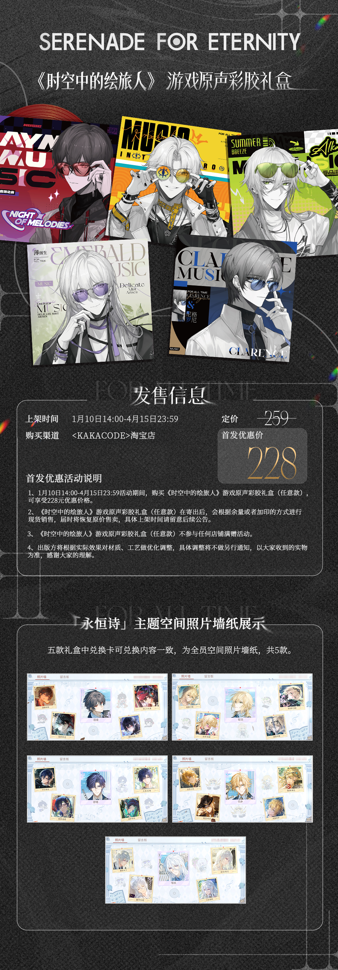► 礼盒内容:主题外盒、彩胶唱片、CD套组、马口铁徽章、收藏乐谱、取碟夹、亚克力仿拨片挂饰、亚克力磁吸仿磁带摆件、收藏海报、线稿收藏棉卡、「永恒诗」主题游戏道具兑换卡(用于兑换「永恒诗」主题空间照片墙纸,共5款)。