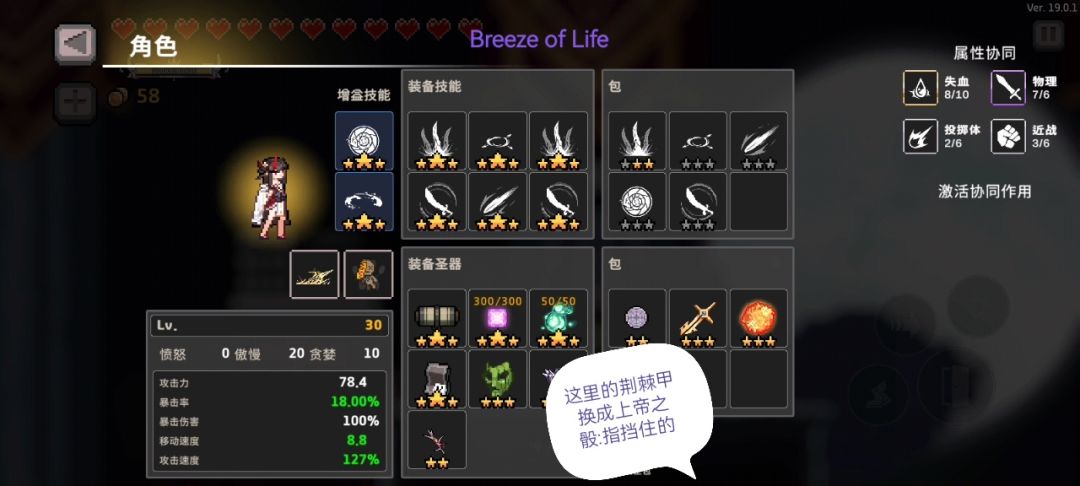 此段萌新向,可看可不看。解释搭配原理。♥圣器解释:其中1.2.3.点是死的。重点说第4.5点,4.结合图片的日志5(投掷体+5),染血荆棘(失血技能+1),做到技能数量最大化,(这里提一嘴,我也测试了日志4(+2),但还不如没它要好。也省一个格子)。秘卷(1.5秒后物理技能再次释放)让伤害频率以及出血频率有很大的提升。5.面具(主要技能激活概率+50%)之所以选他是因为是最高的。荆棘甲(+15%的激活概率)。然后亡焰,核心增加攻击力,用来增加出血伤害。技能按照我的搭配应该就是吃到圣器增益的最大化。♥技能核心解释:2血之枪,2剑是核心。吃圣器增益最满的两个技能。或者是这2个箭(但秒伤略低于2个剑,差不多低100w左右)。剩下2格随便搭配。只不过我给的应该是最好的配置。