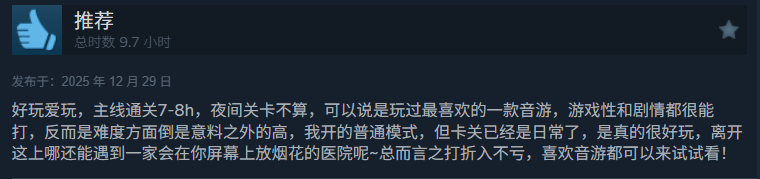 销量不俗的同时,《节奏医生》的口碑也好到爆炸。它在Steam累计收获2.2万条评论和98%好评率,中文区评论量占据半数,整体也是好评如潮。翻看评论区入目遍布「好玩爱玩」,甚至不乏「心目中天花板」的超高评价。