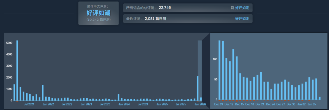 它在2020年就登上Steam夏日新品节,次年发售了EA版,连续更新到2025年底才上线1.0正式版。这款游戏早就显露出不俗的潜力,EA版发售一周时,它就获得了超4000个评价,以及98%的好评率。