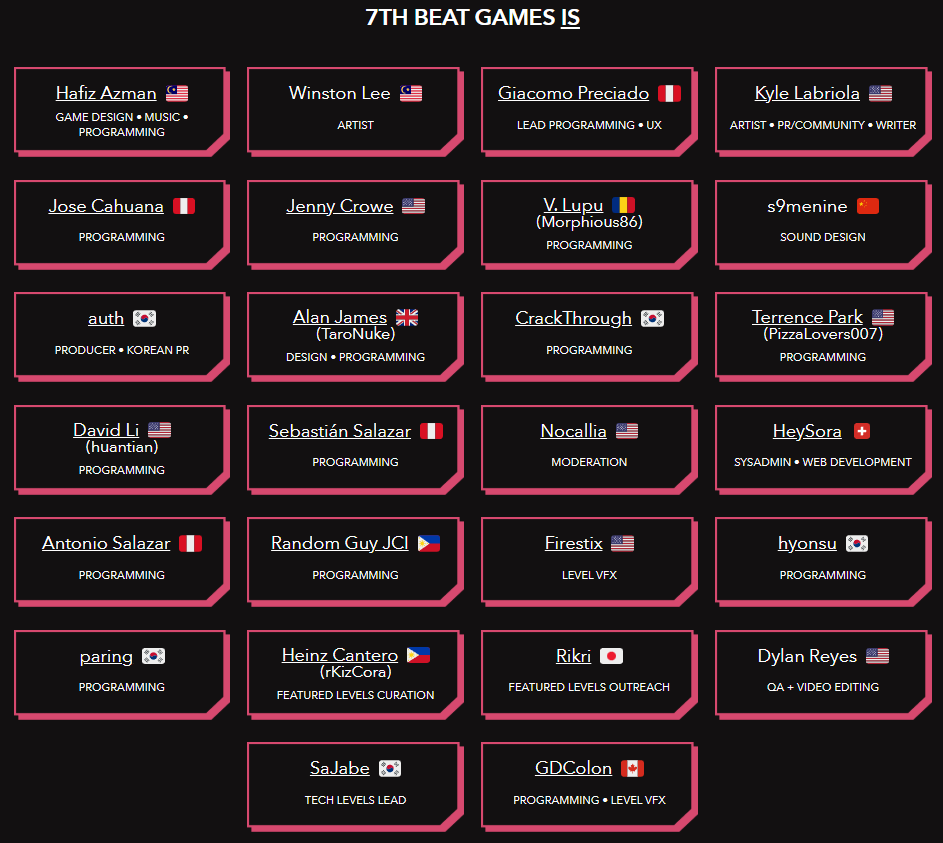 与社区的紧密互动,也让7th Beat Games源源不断地吸引着志同道合的队友。接下来的几年里,陆续有开发者和大神玩家通过社区加入7th Beat Games团队,能看到如今26人的团队里,除了Hafiz和Winston这对好友,其他成员都来自不同的国度。