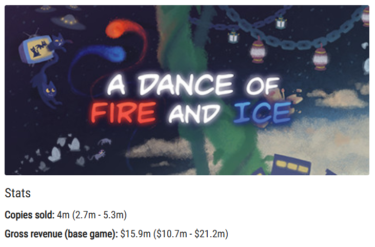 这款游戏在2019年初发售,在2021年初与《节奏医生》推出同捆折扣包后,游戏在线人数飙升至历史峰值,好评率为95%。如今《冰与火之舞》的预估总销量已经突破400万套,总流水接近1600万美金(约1.1亿元),这款游戏的成功,给7th Beat Games带来了丰厚的资金储备。