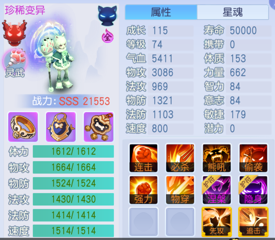 宠物技能熊吼 + 超级必杀 + 超级偷袭 + 超级强力 + 超级物穿 + 超级追击 + 超级先攻 + 超级连击 + 护符(高级保命 + 高级隐身)技能搭配与第一只相似,速度不到1000,超级先攻效果不显,建议换克制或稳定伤害技能。