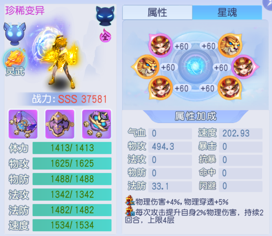 星魂套强化物伤和穿透,理想搭配。物攻和速度属性极致,星魂优秀
