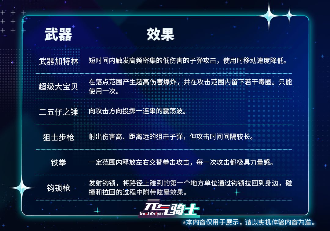 本次测试中实装的内容包括4个角色(每个角色1个技能)、6把武器和25个天赋。角色基本信息可见下表: