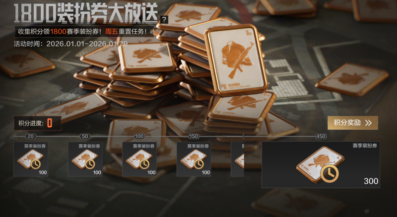 1月1日-1月29日,完成每周任务获得积分,至多可领取1800赛季装扮券!