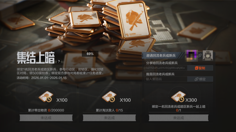 1月1日-1月15日,集结上暗活动开启!绑定暗区老兵或新兵,参与对局即可领取500赛季装扮券!