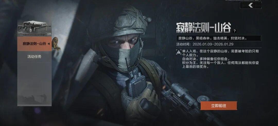 「侠」主题军需免费送二十抽,参与活动即可得!「寂静法则-山谷」已开启,来山谷展开狙击对决!「电视台大师赛」即将结束,立即上暗,抓住最后机会上大分!
