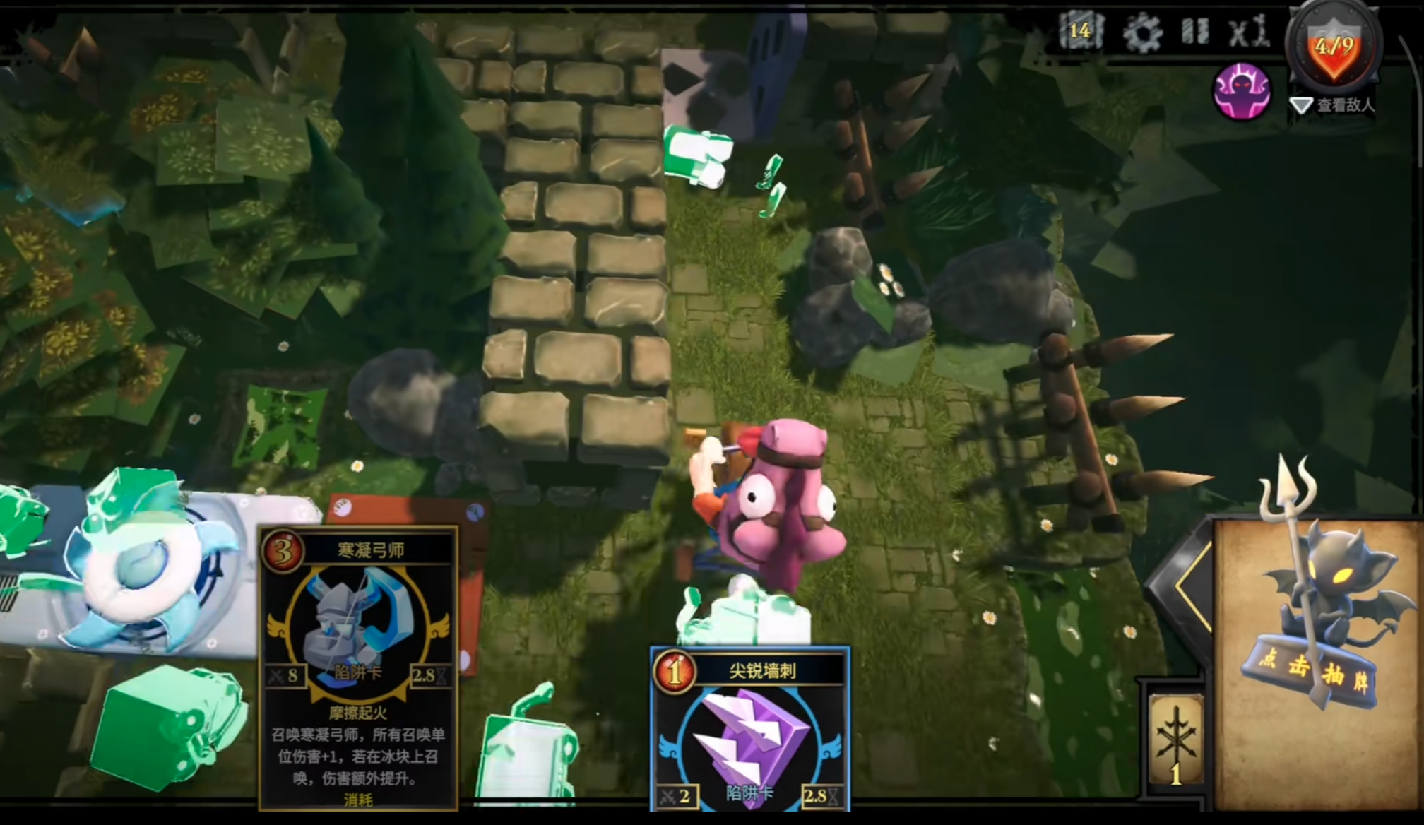 还有地形杀!这个真的是阴怪的神器,一定要用好。每局开局先暂停游戏,看看地图里有没有水域、悬崖这些特殊地形。把弹簧放在靠近这些地形的位置,怪物一踩就直接掉下去,瞬间淘汰,根本不用浪费伤害陷阱。我有一局遇到个多路口的地图,本来以为要翻车,结果发现每个路口都靠近悬崖,我就全堆弹簧,怪物根本没机会靠近祭坛,轻松通关。对了,飞行单位要注意,它们无视地面陷阱,得专门放对空的弩箭或者法术卡,不然会被偷家,我之前就吃过这个亏,气得不行。